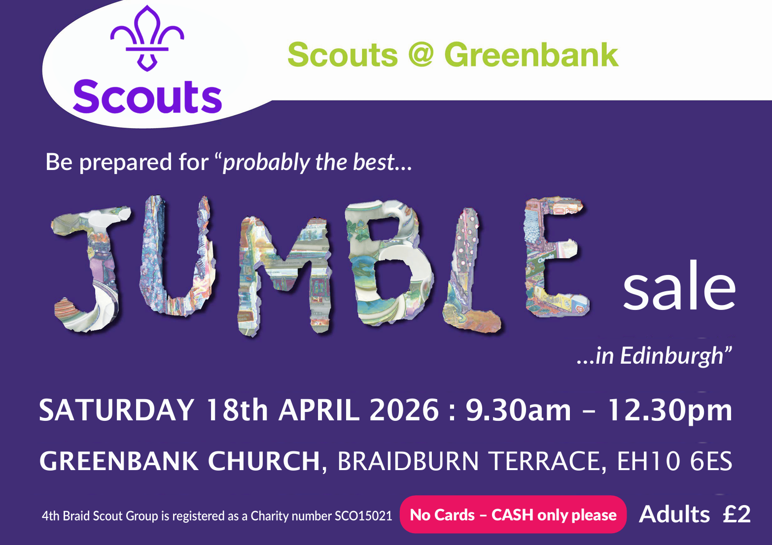 The Greenbank Scout Jumble Sale will be on Saturday 18th April 2026 from 9.30am.